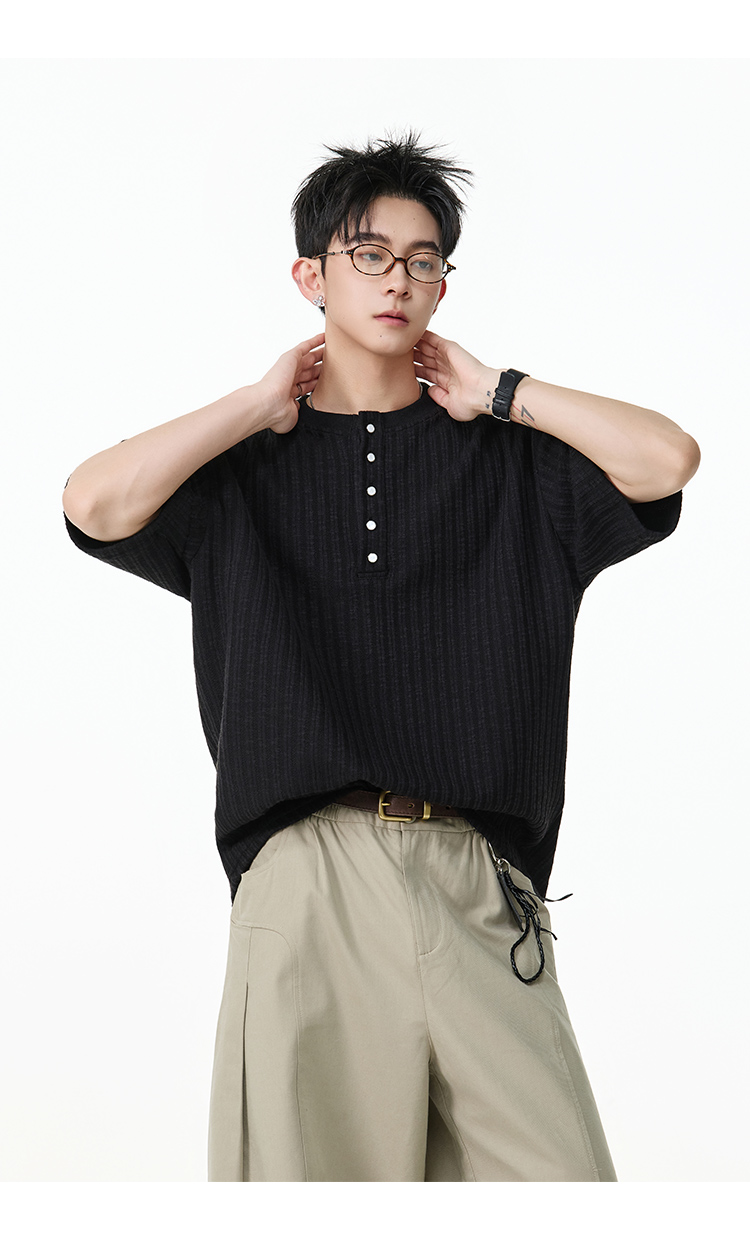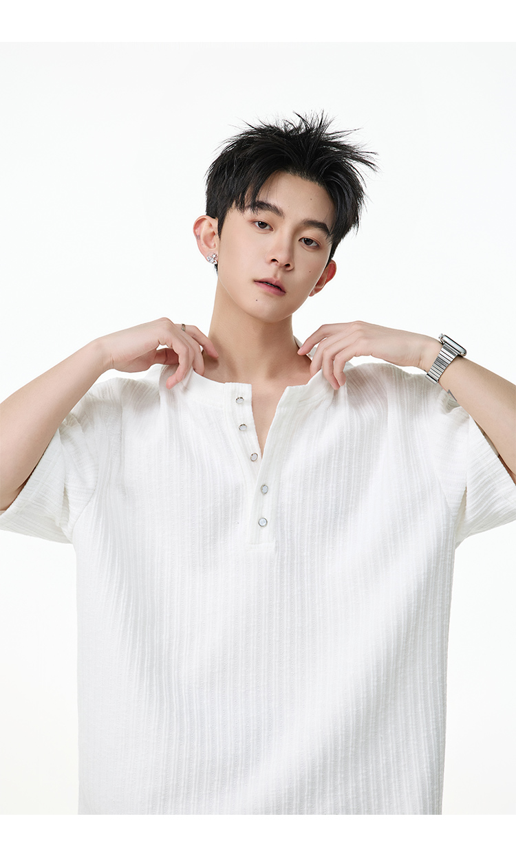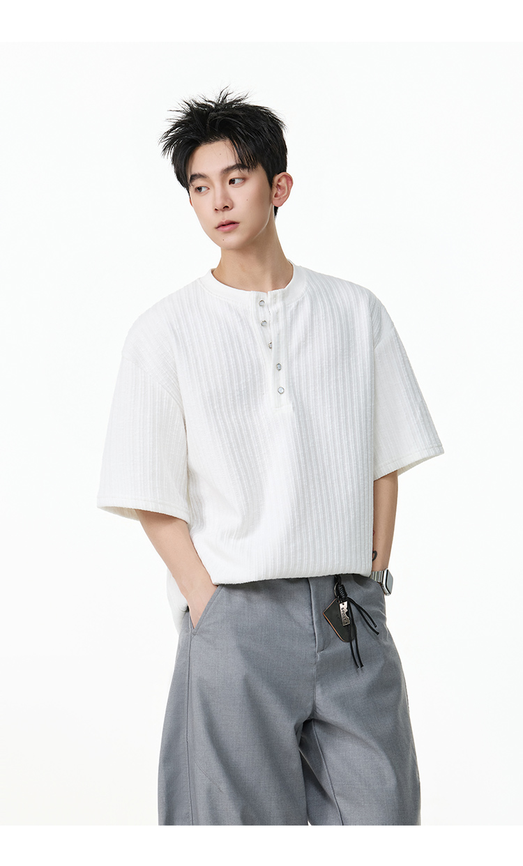強調布料的質感層次,連排扣襟點綴細節,展現俐落氛圍,多層次領口造型,打造低調時尚魅力。