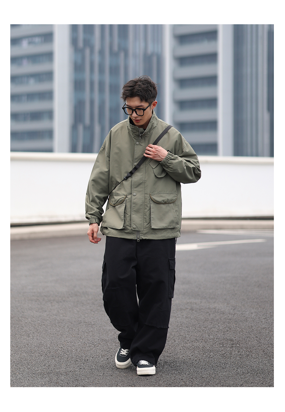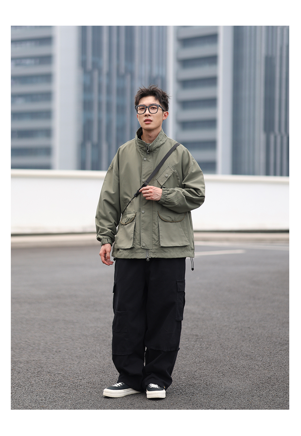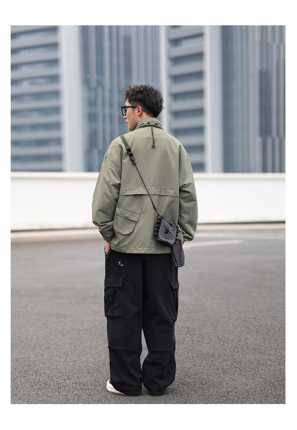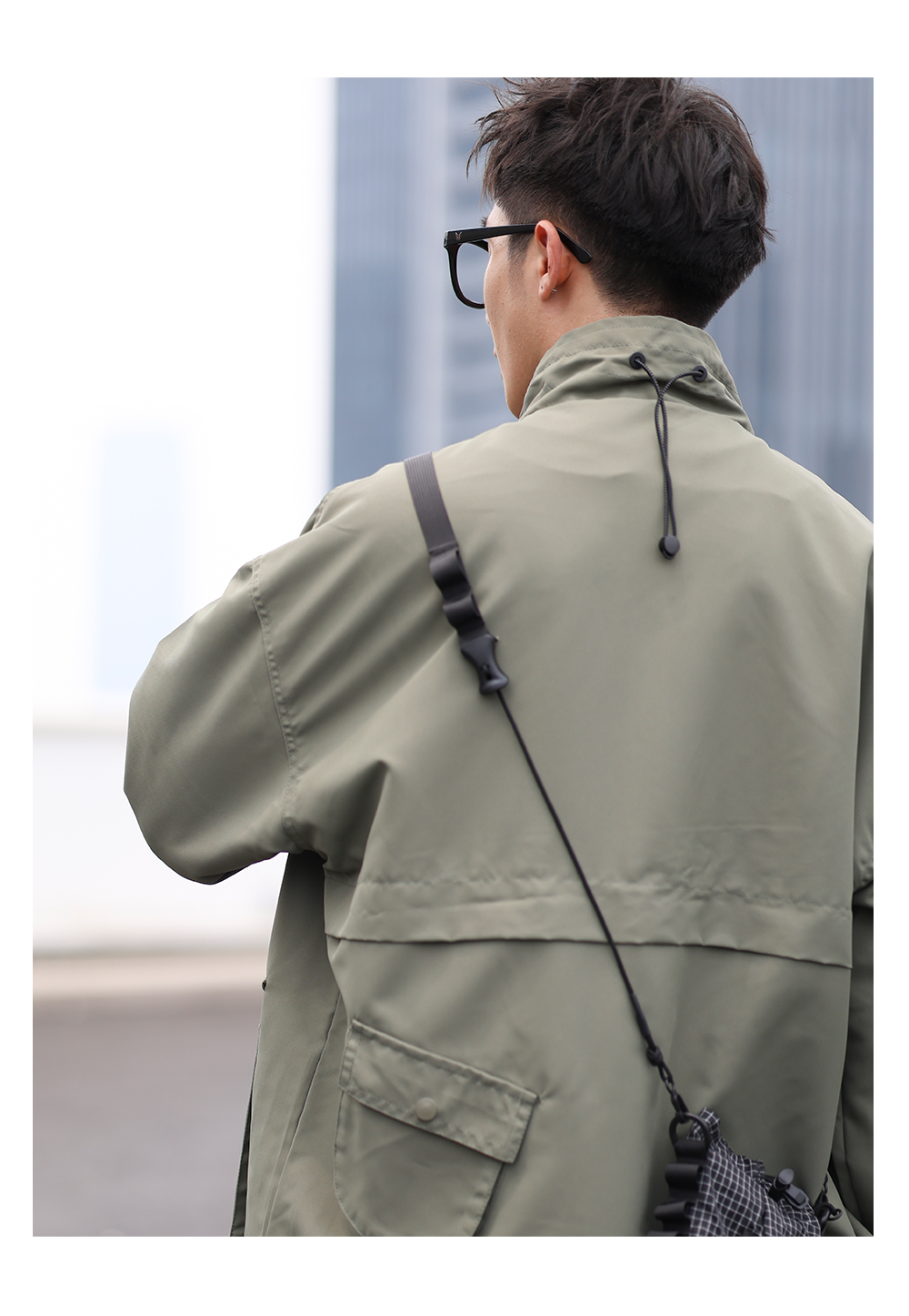 多口袋、耐用面料的硬朗風格;極為寬鬆的輪廓剪裁,簡約俐落的直立領型。