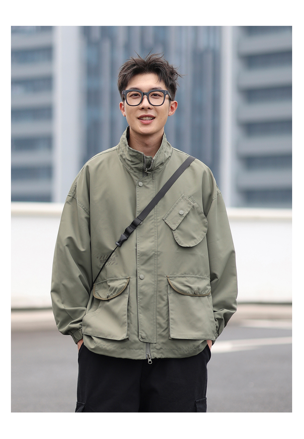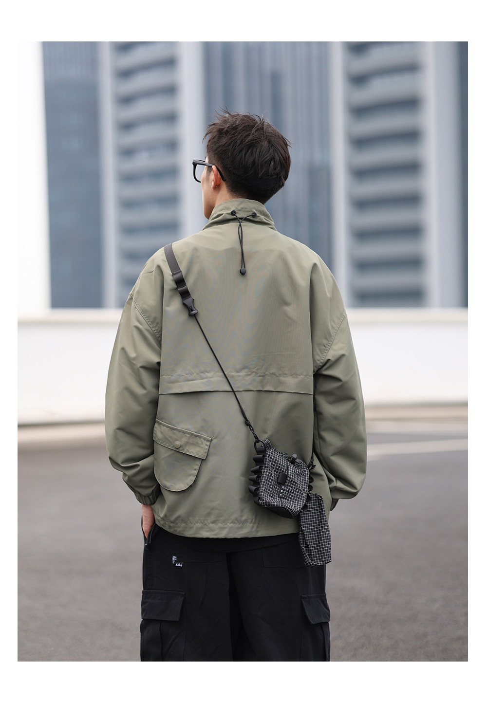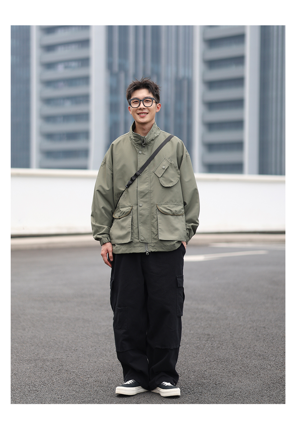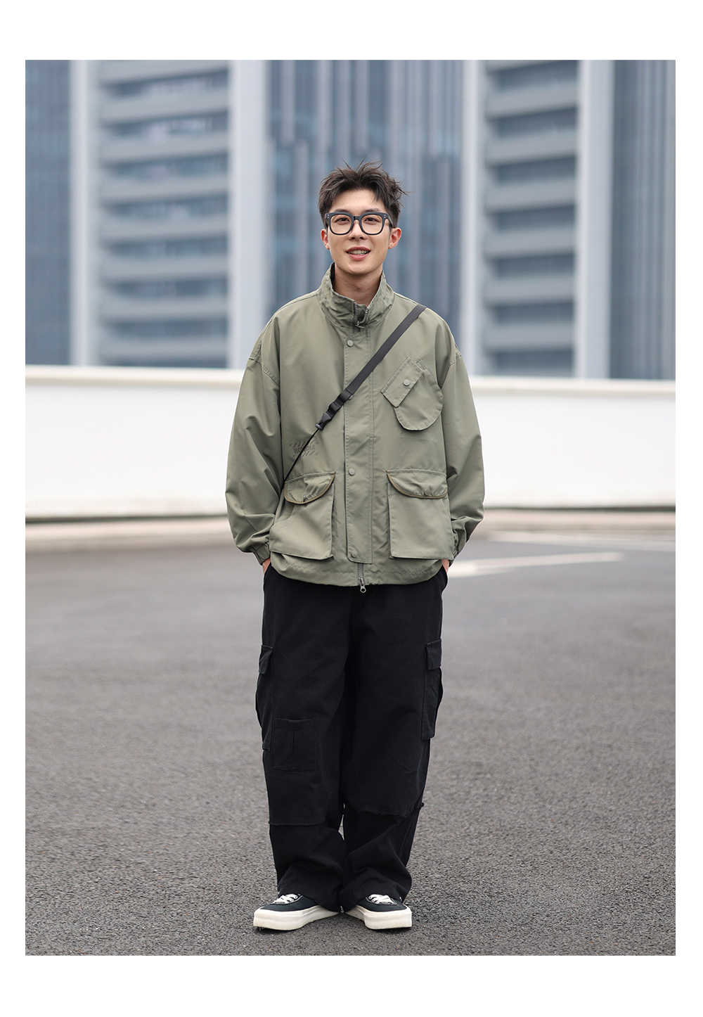 多口袋、耐用面料的硬朗風格;極為寬鬆的輪廓剪裁,簡約俐落的直立領型。