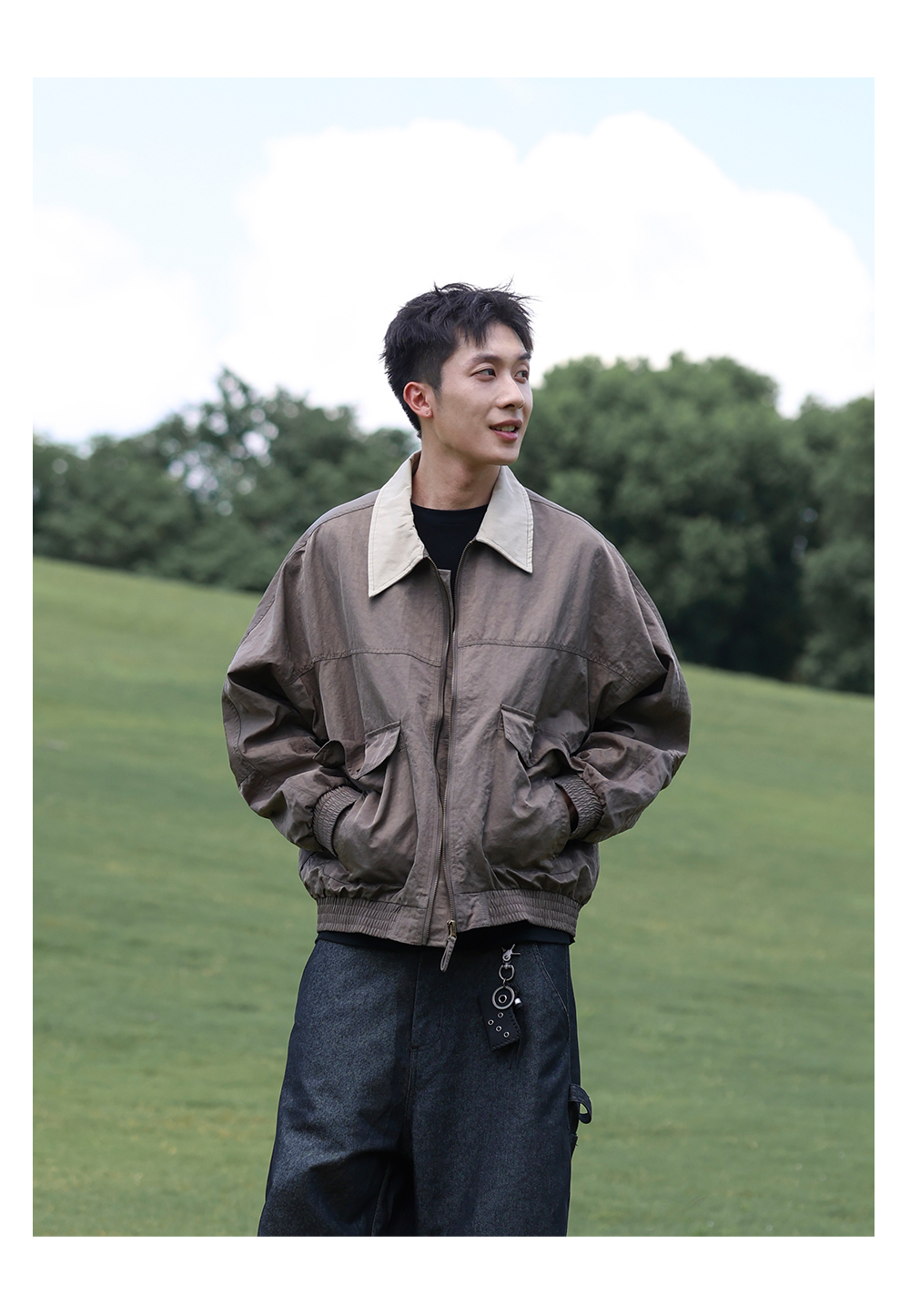 不同元素交錯結合,寬鬆結構展現率性風格,領口翻折增添層次感。